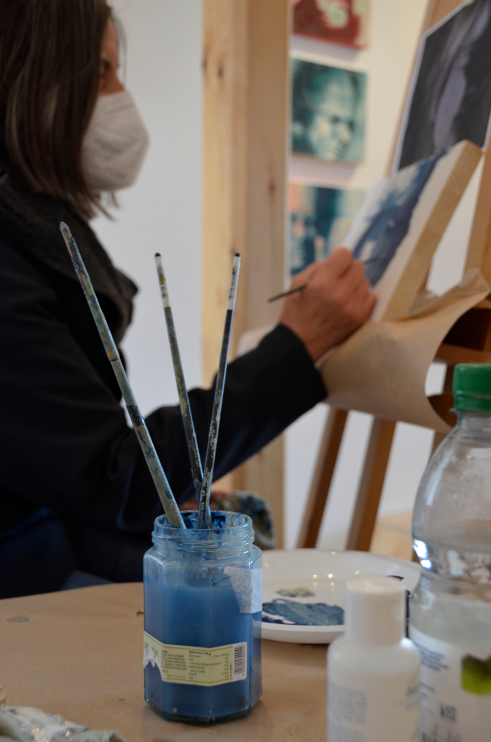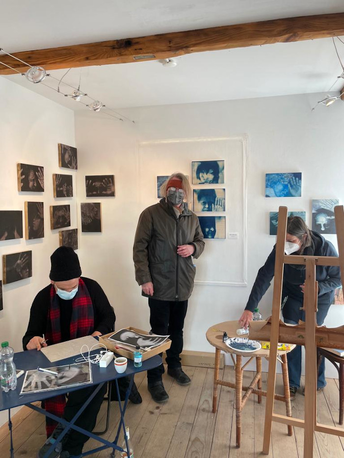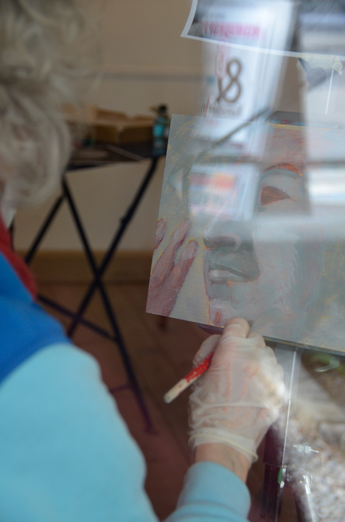 30 (!) Menschen aus der Risikogruppe haben sich kopieren lassen, und drei neue Bilder sind direkt vor Ort entstanden. Jede/r Künstler*in hat weitere fotokopierte Selbstbildnisse mit nach Hause genommen, um dort weiter zu Transformieren. Wenn alle Gesichter in Malerei transformiert worden sind, umfasst die Sammlung «RISIKO MIT GESICHT» bereits 66 Bilder.